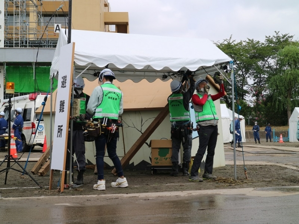 当工組の浦和支部(値賀信彦支部長)、大宮支部(佐藤隆行支部長)、春日部支部(伊藤正一支部長)が、令和4年9月4日(日)にさいたま市大宮区のさいたま市大宮消防署及び合併記念見沼公園で実施された「令和4度さいたま市総合防災訓練・防災フェア」に3支部合同で参加しました。 この訓練は、災害発生時の迅速かつ適切な応急・復旧対策における技能を高め、防災関係機関の連携強化を図ることを目的に実施され、地元の消防や警察、自衛隊、その他の協力機関等71機関が参加し、マグニチュード7.3、最大震度6強のさいたま市直下地震が発生し、電気・ガス・水道等のライフラインに甚大な被害が発生したことを想定し、会場には、がれきが散乱した市内の様子がセットで再現され、倒壊家屋からの救出訓練等が行われました。 |