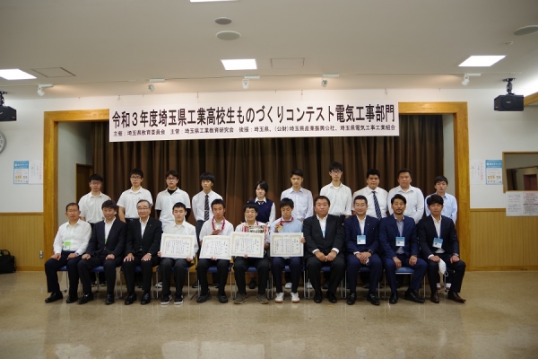 当工組は6月19日(土)に、埼玉県工業教育研究会が開催する令和3年度埼玉県工業高校生ものづくりコンテスト電気工事部門の競技会場・競技用材料・賞品の提供、審査員として青年部会(赤池忠徳会長以下4名)の参加など、コンテストを全面的に支援しました。 競技内容は、合板パネル上に配線図で示された低圧屋内配線工事を指定された材料と工具を使用して制限時間内(100分)に施工するもので、各選手は、日頃の実習の成果を十分に競い合いました。 コンテストの結果は、最優秀賞に川越工業高等学校3年生の山﨑良太さん、優秀賞に熊谷工業高等学校3年生の高野恭介さん、優良賞に秩父農工科学高等学校3年生の島﨑陽向さん、特別賞に久喜工業高等学校3年生の鵜飼太陽さんが入賞し、沼尻芳治理事長の代理として出席した加藤宗一副理事長が入賞者4名に表彰状とメダルを贈呈しました。 |