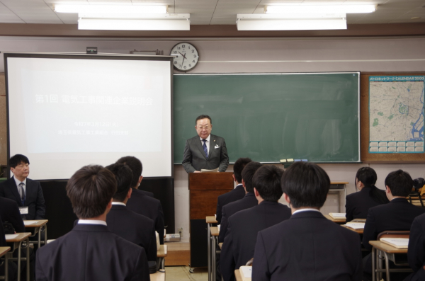 行田支部(羽鳥隆行支部長)は、令和7年3月12日(水)午前10時30分から行田市にある埼玉県立進修館高等学校で第1回電気工事関連企業説明会を開催しました。 この説明会は、生徒たちが授業で行っている電気工事に関する地元企業の業態や実情を説明し、電気工事業界の内容を知ってもらい、日々の学習への取り組みに繋げ、進路選択の一助にしてもらうことを目的とするもので、電気システム科の2年生14名の生徒が参加しました。 組合からは羽鳥支部長、大島征二支部長代行、事務局の3名に加え、組合員企業の㈱ハトリ(羽生市)、㈱リプロ(鴻巣市)、㈲藤間電業(行田市)の3社が参加しました。 開会にあたり、羽鳥支部長から「本日は企業説明会ということで、地元の電気工事業者3社をお呼びしました。電気工事業者といっても、会社によって事業内容はそれぞれ違いますので、説明を聞いていただいて、その中で、少しでも電気工事に興味を持ってもらえるような機会になればと思っております。また、皆様の進路選択に少しでも役に立てればと考えておりますので、よろしくお願いいたします。」などと挨拶がありました。 |