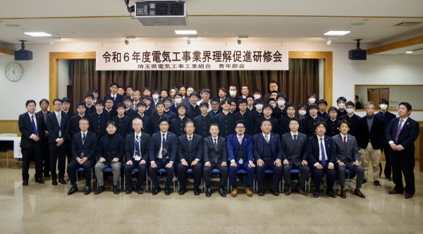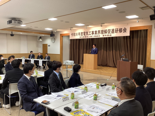 青年部会(小島昇会長)は令和6年12月13日(金)に、埼玉電気会館5階大会議室において「令和6年度電気工事業界理解促進研修会」を開催し、意見交換会とHOMEIoT体験学習を実施した。今回が8回目の開催で、青年部会の会員20名と埼玉県内の工業高校7校から先生、生徒51名が参加しました。 研修会は、事務局の西川潤総務係長の司会で進行し、初めに主催者の小島昇青年部会長が挨拶し、「本日は当組合でも有望な若手経営者を呼んでおりますので、生徒の皆さんには、色々なことを聞いていただき、就職の選択肢の一つに加えていただき、是非、将来は自分で会社を起こして社長となる壮大な夢を持っていただきたいと思います。」などと述べました。 続いて来賓祝辞として埼玉県立児玉高等学校の中山義治校長が「埼玉県電気工事工業組合様には本日の理解促進研修会の他、工業高校生ものづくりコンテスト電気工事部門などでご支援いただき、感謝申し上げます。」などと述べました。 続いて、小島会長が「電気工事業界の実態、並びに魅力ある電気工事業界」について説明。パナソニック㈱エレクトリックワークス社マーケティング本部首都圏電材営業部埼玉電材営業所営業一課の則太介課長が「電機メーカーから見た電気工事業界」について説明しました。 |