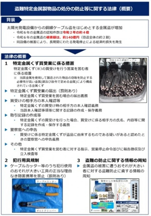 ケーブル窃盗等が増加していることを踏まえ、金属くず買受業に係る措置等を内容とする「盗難特定金属製物品の処分の防止等に関する法律」(金属盗対策法)が成立・公布され、令和7年9月1日からの施行されることとなりました。