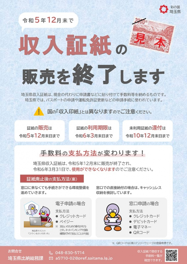 埼玉県では、令和5年12月末日をもって埼玉県収入証紙の販売を終了いたします。 埼玉県収入証紙は、令和6年3月31日で、使用ができなくなりますのでご注意ください。 ※国が発行している「収入印紙(いんし)」とは異なります。 詳しくは埼玉県のホームページをご覧ください。 https://www.pref.saitama.lg.jp/a1201/shoushi/shoushi-haishi.html |