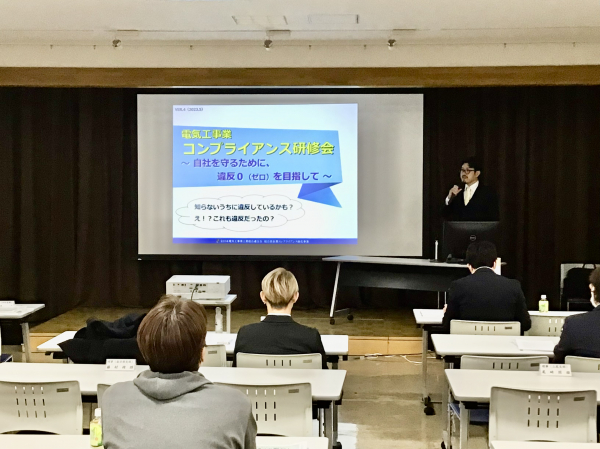 青年部会(小島昇会長)は令和6年2月2日(金)に埼玉電気会館5階大会議室で電気工事業コンプライアンス研修会を開催しました。 研修会は、事務局の西川潤係長の司会で進行し、初めに主催者の小島昇会長が挨拶し「皆さまが、日々電気工事を行っていく上で技術、資格、安全と言った面には意識も高く、また組合でもそのような研修に取り組んできました。それに加え、関連法令の遵守も重要です。自社を守るために研修し、クリーンな業界づくりを推進し、違反ゼロを目指しましょう」などと呼びかけました。 続いて、研修会に入り、電気工事二法を柴崎弓弦副会長が、建設業法を石川和希副会長が、労働安全衛生法などを石井健太郎副会長が、さらに電気工事業関連の法律を深掘りした内容を赤池忠徳相談役理事がそれぞれ解説し、参加者は真剣に聞き入っていました。 また、西川係長から組合が実施している認定訓練や全日電工連各種福利厚生制度や発行冊子についても説明があり、研修会実施後には情報交換会として電気工事業法や労働安全衛生法遵守のための自社の取組み事例等を共有し、大変有意義な研修会となりました。 |