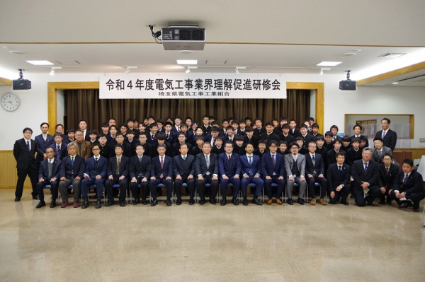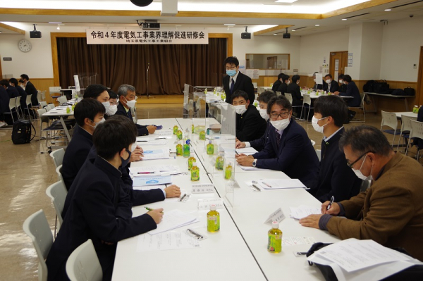当工組の青年部会(赤池忠徳会長)は令和4年12月14日(水)午後2時からさいたま市北区の埼玉電気会館において「令和4年度電気工事業界理解促進研修会」を開催し、意見交換会と電気体験学習を実施しました。この研修会は平成26年から開催しており、今回で6回目となります。 当日は、青年部会の会員等18名と埼玉県内の工業高校8校の先生、生徒約80名が参加しました。 |