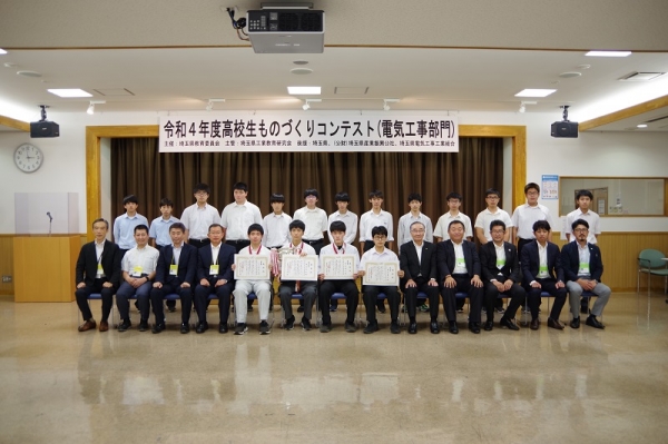 青年部会が審査を担当 当工組は6月25日(土)に、埼玉県教育委員会が主催する「令和4年度高校生ものづくりコンテスト(電気工事部門)」の競技会場・競技用材料・賞品の提供、審査員として青年部会(赤池忠徳会長以下4名)の参加など、コンテストを全面的に支援しました。 競技内容は、合板パネル上に配線図で示された低圧屋内配線工事を指定された材料と工具を使用して制限時間内(90分)に施工するもので、各選手は、日頃の実習の成果を十分に競い合いました。 コンテストの結果は、最優秀賞に三郷工業技術高等学校3年生の豊田晃生さん、優秀賞に熊谷工業高等学校2年生の清水翔太さん、優良賞に三郷工業技術高等学校2年生の川口由紀斗さん、特別賞に春日部工業高等学校3年生の菊池寛大さんが入賞し、沼尻芳治理事長の代理として出席した加藤宗一副理事長が健闘を称え、入賞者4名に表彰状とメダルを贈呈しました。 |