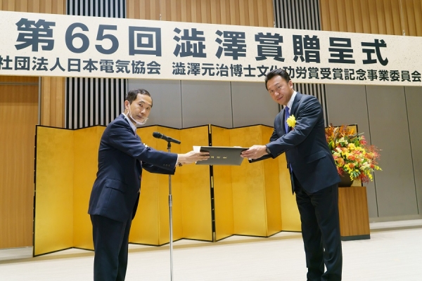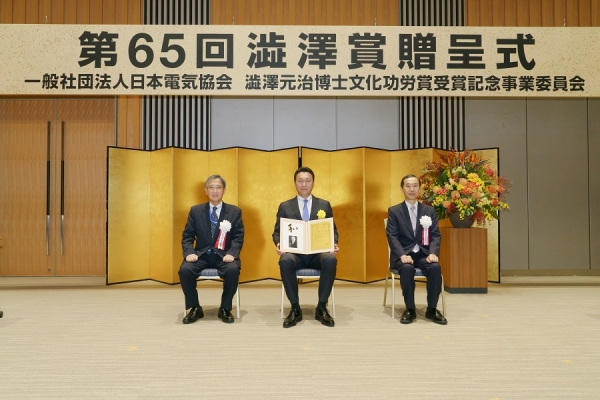 一般社団法日本電気協会・澁澤元治博士文化功労賞受賞記念事業委員会は、11月17日(火)に東京都千代田区の東京商工会議所渋沢ホールで「第65回澁澤賞贈呈式」を開催し、当工組から佐藤隆行常務理事(大宮支部長、㈱ハスヌマ電気 代表取締役)が栄えある受賞の栄誉に輝きました。 贈呈式は新型コロナウイルス感染防止対策として、YouTubeにて配信しております。 https://www.denki.or.jp/award/ceremony 受賞の様子 51:50~ |