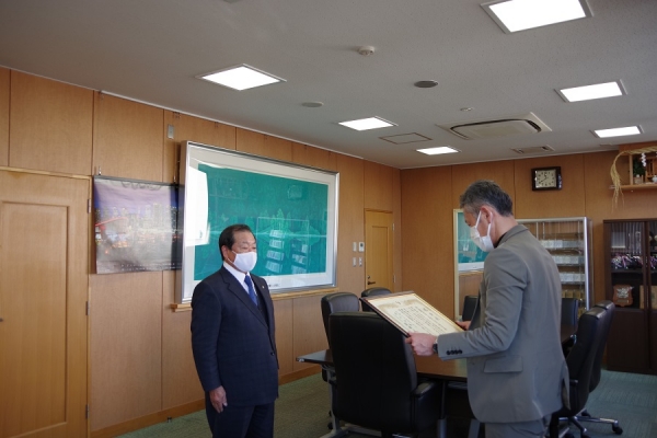 江野会長(左)から委嘱状を授与される比嘉委員長(右)