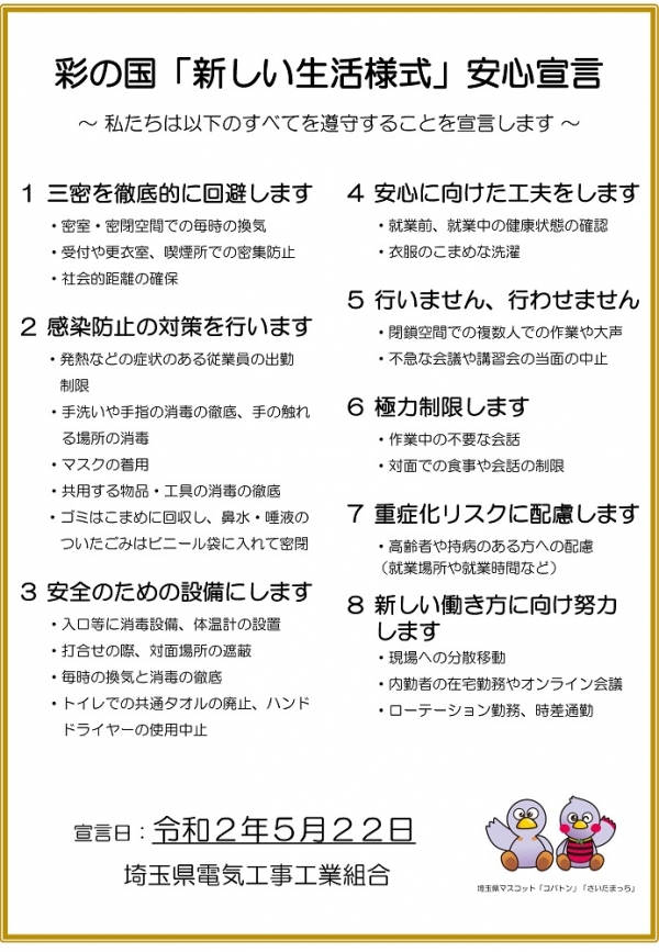 埼玉県電気工事工業組合では、埼玉県が推進する、新型コロナウイルスと共存しつつ、社会経済活動を行いながら感染拡大を予防する「新しい生活様式」の取り組みに賛同し、「彩の国『新しい生活様式』安心宣言」を宣言いたします。 この安心宣言は、感染防止の取組を業界にとらわれず全産業が進めることで多くの事業者の社会経済活動を促し、県民の皆様にとってもより安心して暮らせる環境づくりを進めるもので、我々電気工事業界も積極的に新型コロナウィルスに負けない環境づくりを推進してまいります。 「新しい生活様式」安心宣言はこちら(PDF) |