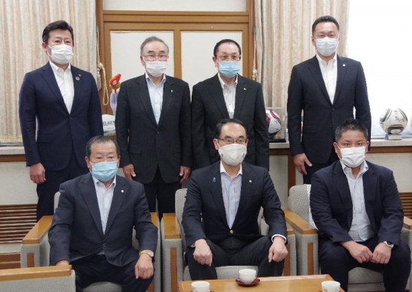当工組は、5月12日に埼玉県と「住宅用太陽光発電サポート事業に関する協定」を締結しました。当時はコロナ禍の中で締結式が実施できなかったため、緊急事態宣言解除後の6月10日に、沼尻芳治理事長、加藤宗一、藤田征夫、値賀信彦副理事長、佐藤隆行常務理事の5名で大野元裕知事、田村琢実県議会議長を表敬訪問しました。 この協定は、住宅用太陽光発電設備や蓄電池の導入、点検・維持管理や撤去、災害等により破損した設備の取り扱い等に関する県民からの相談に、県と連携して組合が対応することを定めた協定で、沼尻理事長は「この協定締結を機に、太陽光設備を含めた安心な電気の供給に組合員一丸となって取り組みたい。」と述べました。 |